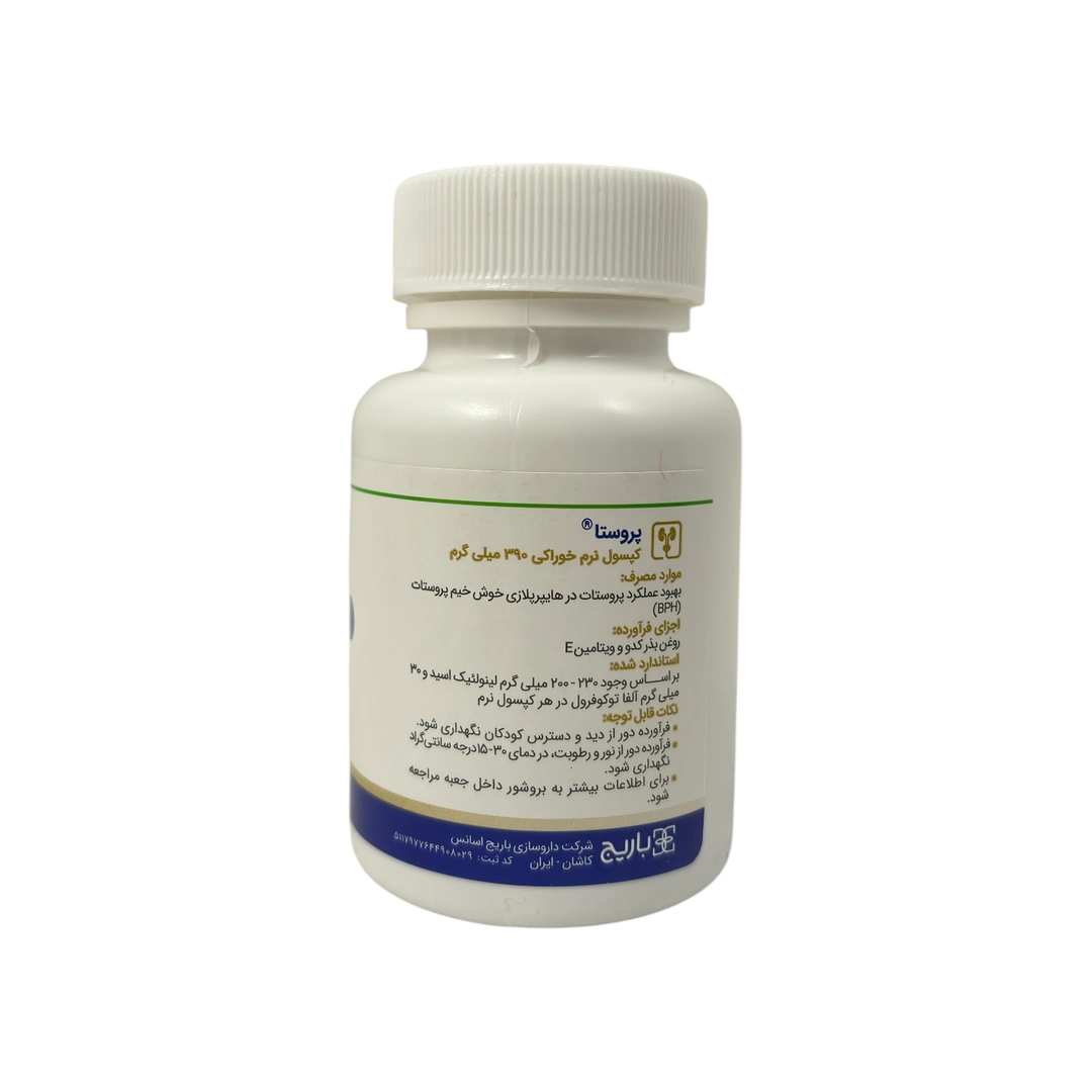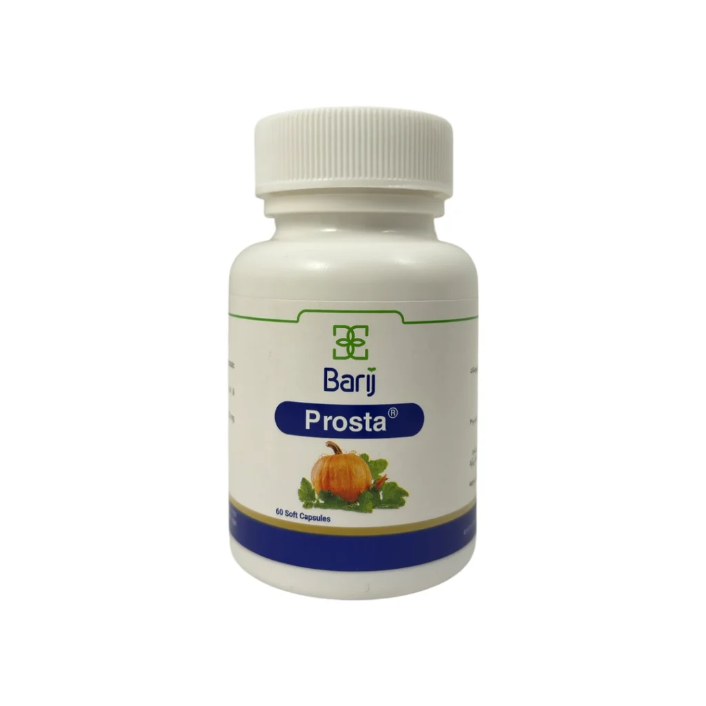 کپسول پروستا باریج اسانس، یک مکمل گیاهی موثر برای بهبود عملکرد پروستات در مردان است. این محصول با ترکیب روغن بذر کدو و ویتامین E، به کاهش علائم هایپرپلازی خوشخیم پروستات (BPH) مانند تکرر ادرار، نیاز فوری به دفع ادرار و احساس عدم تخلیه کامل مثانه کمک میکند. همچنین، این کپسول در کاهش ریزش موی آندروژنیک (هورمونی) و تقویت سلامت موها موثر است. مصرف روزانه یک عدد کپسول همراه با آب، به حفظ سلامت پروستات و بهبود کیفیت زندگی مردان کمک میکند.